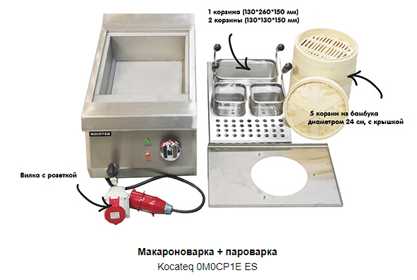 Макароноварка-пароварка Kocateq 0M0CP1E ES - уникальное оборудование, сочетающее в себе функции как макароноварки, так и пароварки, благодаря комплектации специальными корзинами из бамбука!