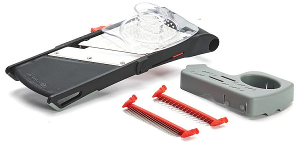 В комплекте: толкатель, горизонтальное двойное лезвие (регулируется по высоте), два фигурных лезвия "жульен" 2 и 4 мм