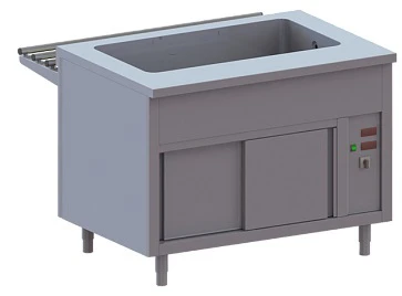 Мармит оснащен тепловым шкафом, что позволяет использовать его как дополнительный элемент для кратковременного хранения, поддержания в горячем состоянии готовых блюд на полках нижнего шкафа.