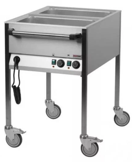 • Мармит вторых блюд электрический, парового типа (водяная баня), напольный, на открытом стенде, оснащен 2 штампованными ваннами вместимостью GN1/1-200мм каждая, продольного расположения; панелью управления по короткой стороне, сливными кранами, ручкой для транспортировки, угловыми бамперами, витым проводом.