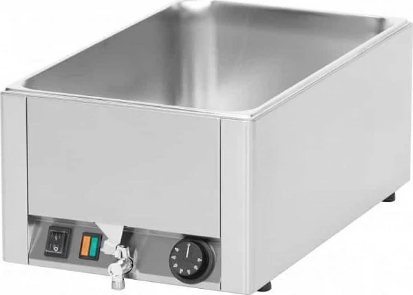 • Мармит электрический, парового типа, настольный оснащен 1 штампованной ванной вместимостью 1GN1/1-150мм, безопасным сливным краном.