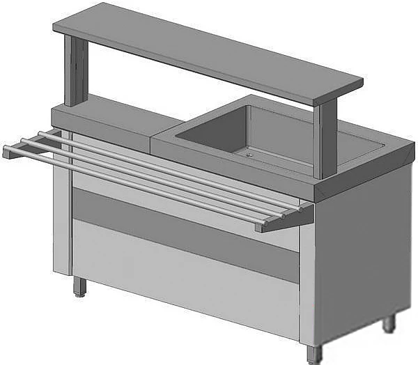 Оборудование оснащено электрической конфоркой и ванной для поддержания температуры с помощью горячей воды. Конструкция снабжена вместительной двухуровневой полкой и направляющей для подносов.