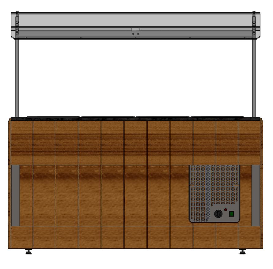 Мармит имеет светодиодную подсветку в нишах фасадных частей и подсветку рабочей зоны (световое оборудование под стеклянной полкой.