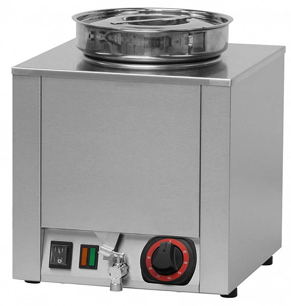 • Мармит электрический, парового типа, настольный оснащён 1 цилиндрической ёмкостью объёмом 1х4,5л из нержавеющей стали, безопасным сливным краном.