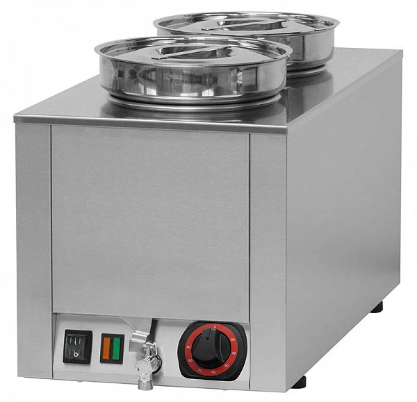 • Мармит электрический, парового типа, настольный оснащён 2 цилиндрическими ёмкостями объёмом 2х4,5л из нержавеющей стали, безопасным сливным краном.