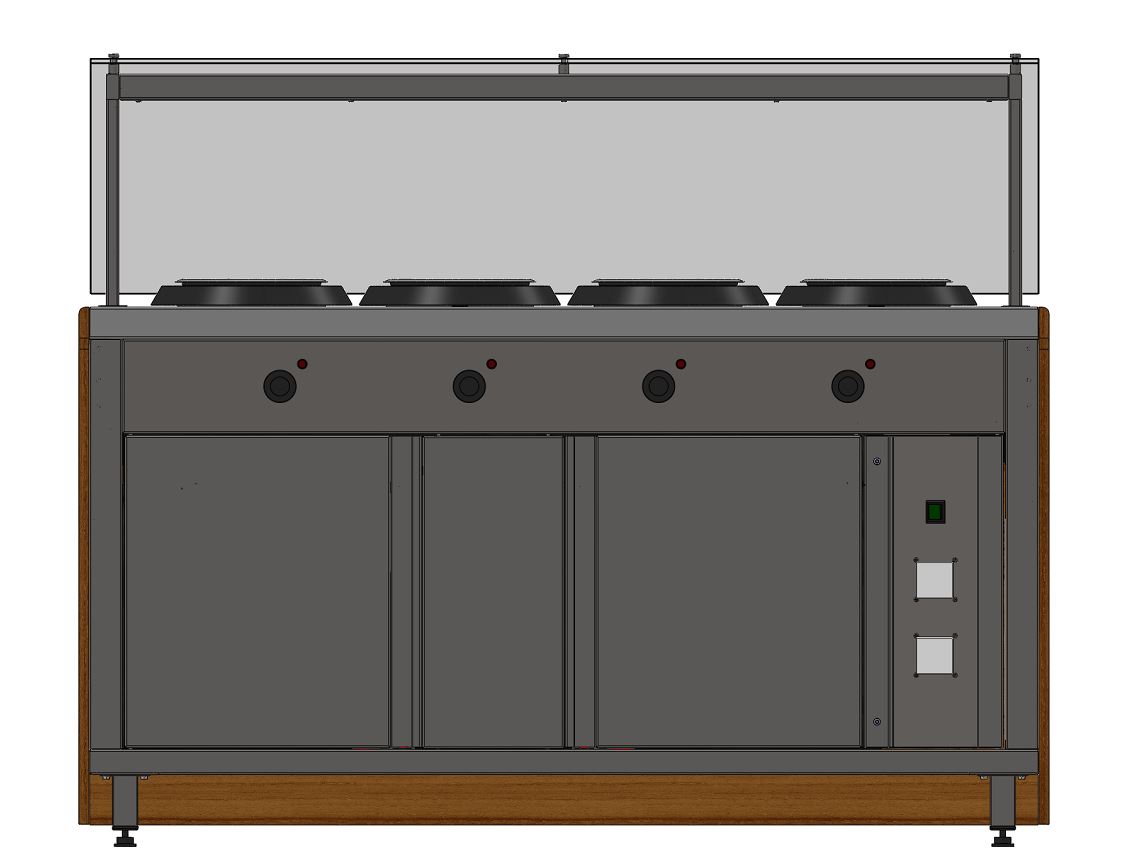 Мармит оснащен полкой и защитными стеклами.