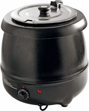 Оснащена съемной крышкой с изолированной ручкой и выемкой для половника, емкостью для воды, регулятором мощности нагрева и устойчивыми ножками. Стальной корпус, окрашенный в черный цвет.