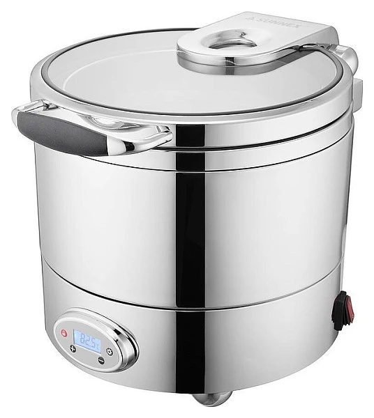 Мармит первых блюд Sunnex 10 л Burano W10-50111-UBU предназначен для постоянного подогрева первых блюд и поддержания их оптимальной температуры на предприятиях общественного питания и торговли. Модель круглого сечения оснащена откидной крышкой с рукояткой и фронтальной панелью управления овальной формы с цифровым дисплеем. Корпус выполнен из высококачественной нержавеющей стали с серебристой поверхностью, остекление – из закаленного стекла.