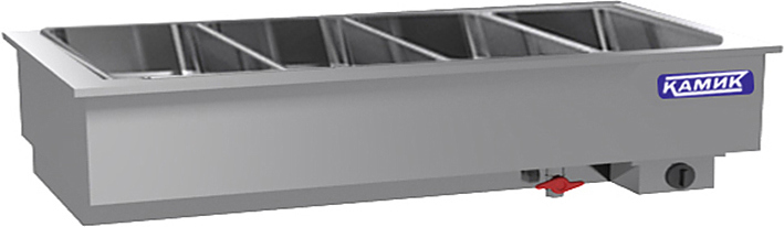 Мармит встраиваемый Камик МУ-344933 используется на предприятиях общественного питания и торговли для кратковременного хранения, демонстрации и поддержания в теплом состоянии супов, гарниров, вторых блюд и соусов.