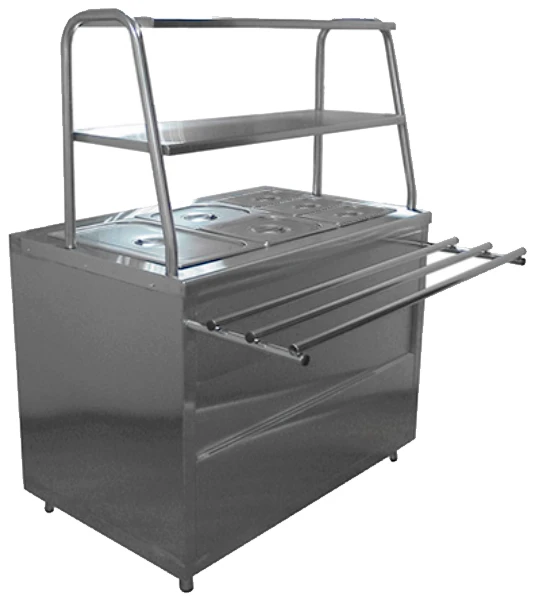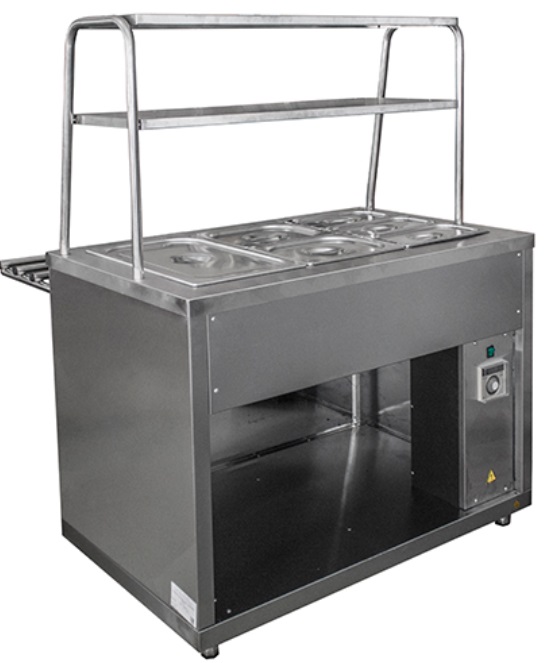 Комплектуется двумя верхними полками для тарелок, гастроёмкостями с крышкой и направляющими для подносов. Мармит устанавливается на предприятиях общественного питания самостоятельно или в составе технологической линии раздачи.