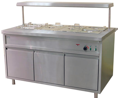 При понижении уровня воды в ванне ниже допустимого, терморегулятор защиты Тэна от «сухого хода» отключает ТЭН, при этом звучит звуковой сигнал и горит сигнальная лампа «нет воды». Размеры ванны позволяют устанавливать на мармит гастроёмкости, глубиной до 200мм.