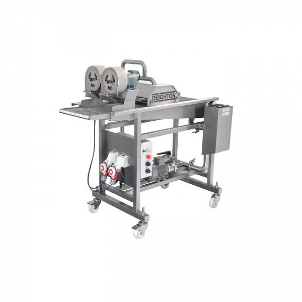 Машина панировочная Deighton ECONOROBE 300 MM предназначена для нанесения жидкой панировки на поверхность полуфабрикатов (куриные крылышки, грудки и др.) на предприятиях общественного питания и торговли. Модель состоит из основания на колесах, сетчатого транспортера, ванны для льезона (кляра), центробежного насоса для перекачивания жидкости, воздушного шабера для удаления излишек панировки.