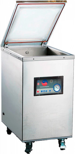 Корпус и камера вакуумного упаковщика выполнены из пищевой нержавеющей стали, что увеличивает износостойкость к агрессивным средам.