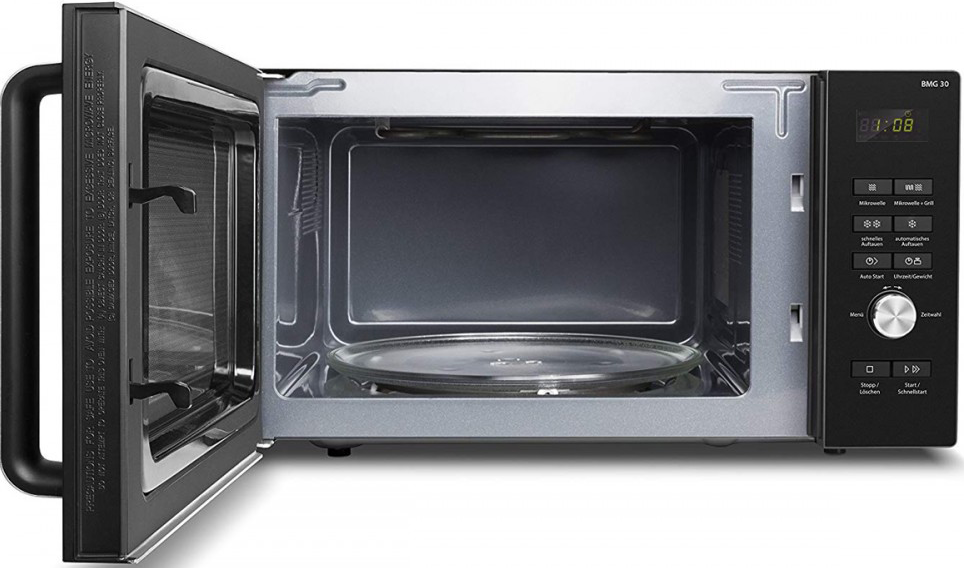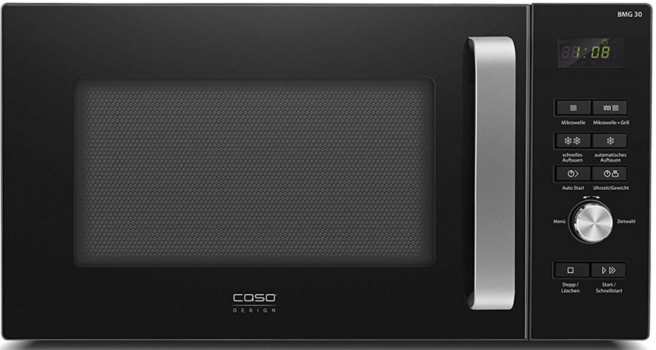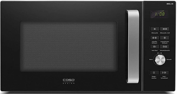 Микроволновая печь с грилем Caso BMG 30 предназначена для разогрева, размораживания и приготовления продуктов в частных домах, квартирах, отелях и офисах. Модель оснащена цифровой панелью управления с красными иконками и дисплем с часами. Внутреннее покрытие выполнено из лакированной стали, ручка - из алюминия, вращающаяся тарелка - из стекла.