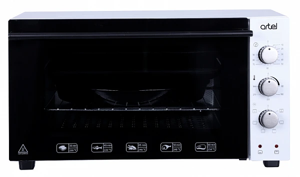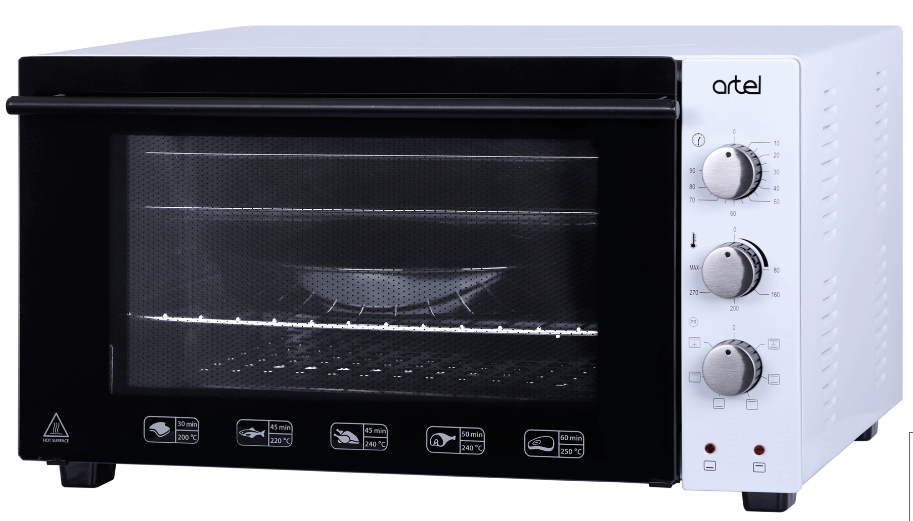 Мини-печь ARTEL MD-4218LUX белый-белый обладает восхитительным дизайном, который идеально впишется в любой интерьер. Благодаря большому объему в 42 литра, он прекрасно подходит для большой семьи. Мини-печь с конвекцией готовит блюда и выпечку быстро и равномерно за счёт распределения горячего воздуха вентилятором. Благодаря лампе, установленной в мини-печи, у вас никогда не возникнет неудобств даже в условиях низкой освещенности. Мини-печь Artel имеют специальное внутреннее покрытие, на котором не остается никаких царапин даже при продолжительных высоких температурах. Удобная съемная дверца вкупе с каленным термостойким стеклом дарят вам комфорт и надежность на многие годы. В мини-печи два нагревательных элемента, что даёт возможность установки трёх режимов: • гриль-нагрев • нижний нагрев • режим одновременного нагрева. Равномерное обжаривание необходимо для приготовления мяса или рыбы, запекание овощей достигается одновременной работой нижнего и верхнего нагрева.