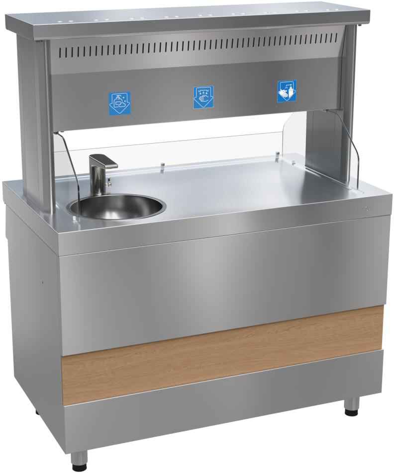 Возможность установить модуль непосредственно в линии раздачи питания для проведения дезинфекции рук перед приемом пищи