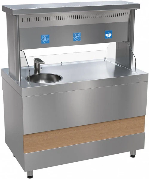 Модуль дезинфекции рук представляет собой тумбу и установленную на стойках секцию для дезинфекции. В секции со стороны обслуживающего персонала имеются две дверки с замками. Одна из дверок открывает доступ к автоматическому бесконтактному дозатору жидкого мыла, а вторая – к обслуживанию автоматического бесконтактного дозатора антисептика. В центральной части секции установлена электросушилка для рук. Настройка автоматического бесконтактного дозатора жидкого мыла и автоматического бесконтактного дозатора антисептика производится сервисными кнопками, расположенными рядом с устройствами дозирования. На столешнице тумбы установлены раковина и сенсорный смеситель для воды. На панели управления тумбы расположены ряд электрических выключателей, которые подают электрическое питание ко всем устройствам модуля. На столешнице тумбы установлены защитные стекла для предотвращения разбрызгивания воды и антисептика за пределы модуля.