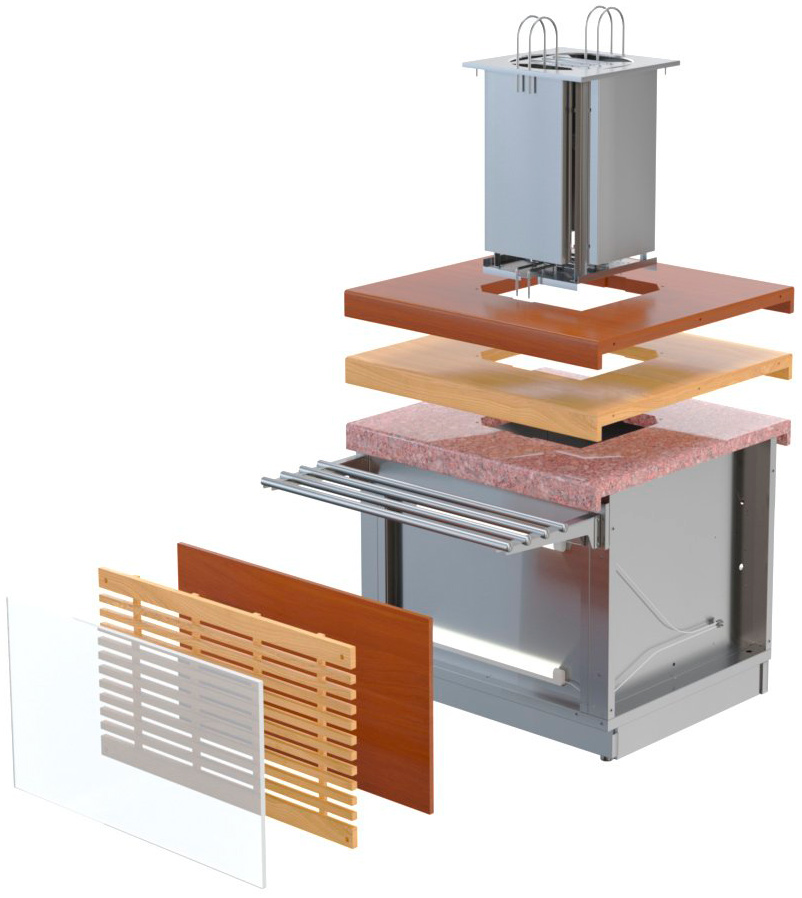 Тумбы модулей линии раздачи питания "Регата" могут быть облицованы декоративными панелями. Варианты панелей и столешниц могут быть любыми - из различного материала разных расцветок: