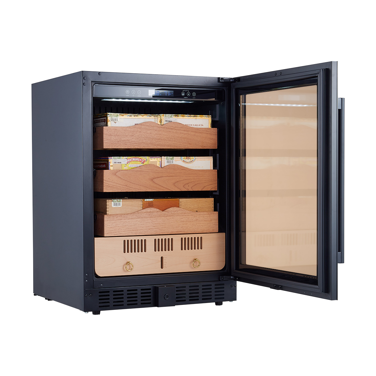 Внутри модели автоматически поддерживается заданная пользователем температура, а постоянный контроль уровня воды и большая поверхность испарения обеспечивают непрерывное увлажнение воздуха внутри шкафа, что создает оптимальные условия для сохранения качества и вкуса сигар в течение длительного времени.