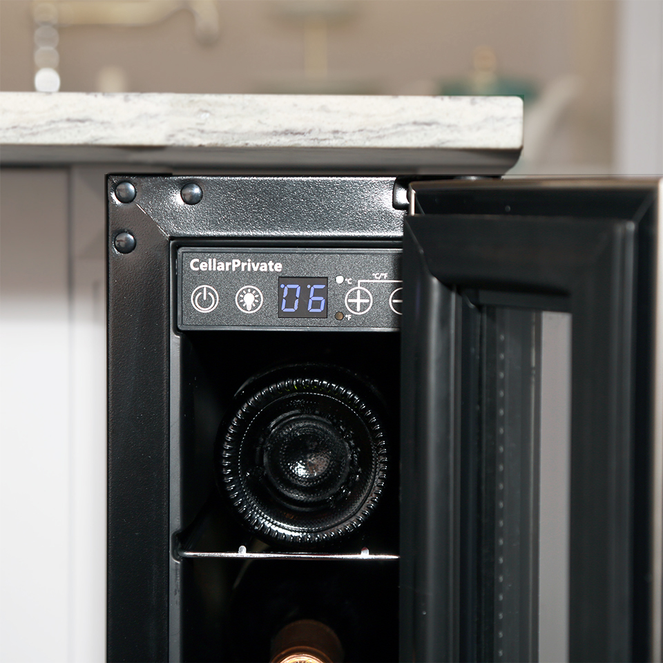 Каждая бутылка вина постоянно проветривается при помощи бесшумных вентиляторов установленных внутри винного шкафа.