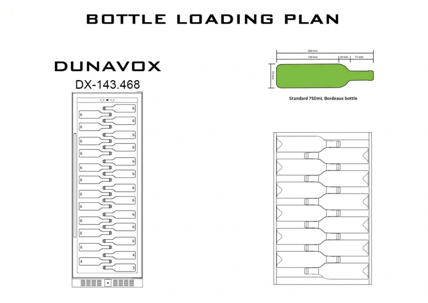 Винный шкаф Dunavox DX-143.468SS может использоваться как отдельностоящий, так и встраиваемый в нишу с соблюдением необходимых для охлаждения зазоров 1-5 см, так как охлаждение винного шкафа осуществляется через нагрев боковых стенок. А также под винным шкафом желательно сделать воздухозаборную решётку, так как охлаждение системы компрессора организовано через вентиляционные решетки внизу шкафа.
