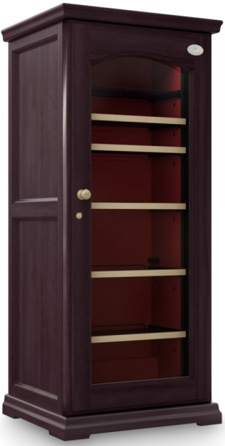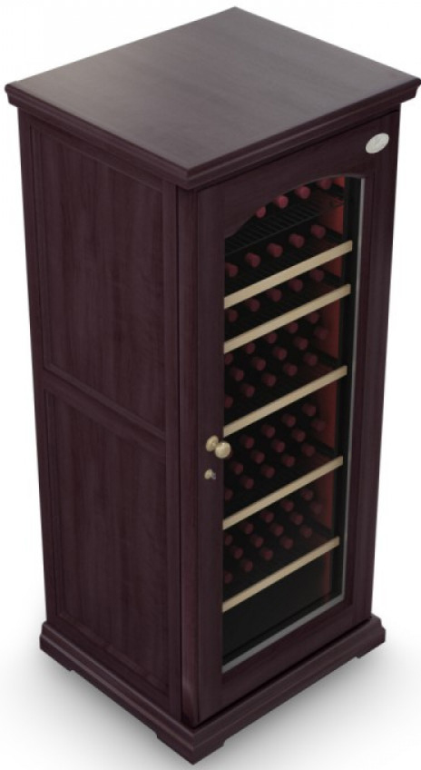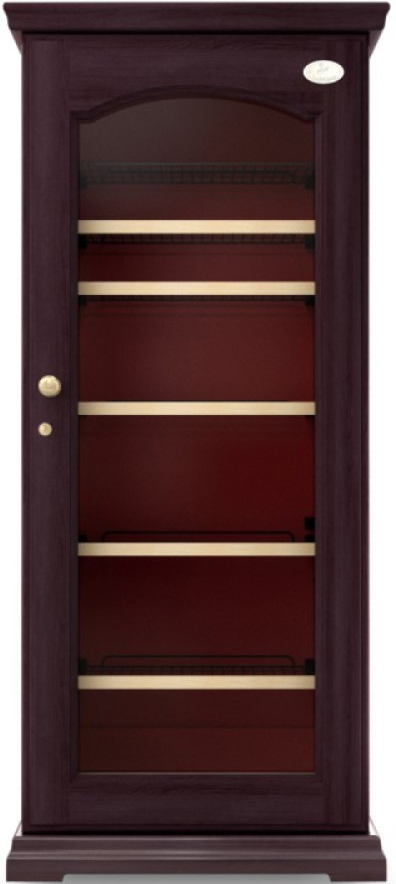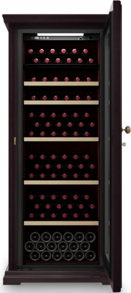 Корпус холодильника металлический, внешняя отделка винного шкафа выполнена из древесины Risto Line в четырех цветовых решениях. Дверца выполнена из двойного тонированного стеклопакета с защитой от уф лучей, имеет встроенный замок и удобную ручку в классическом стиле.