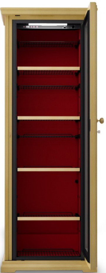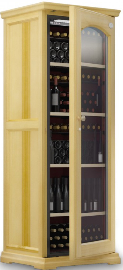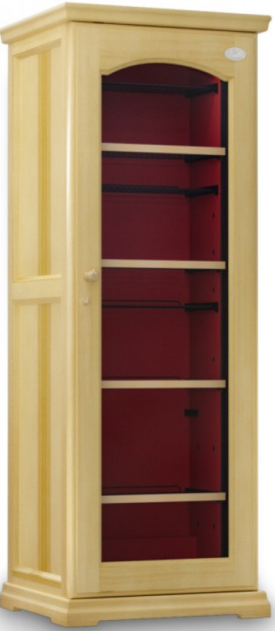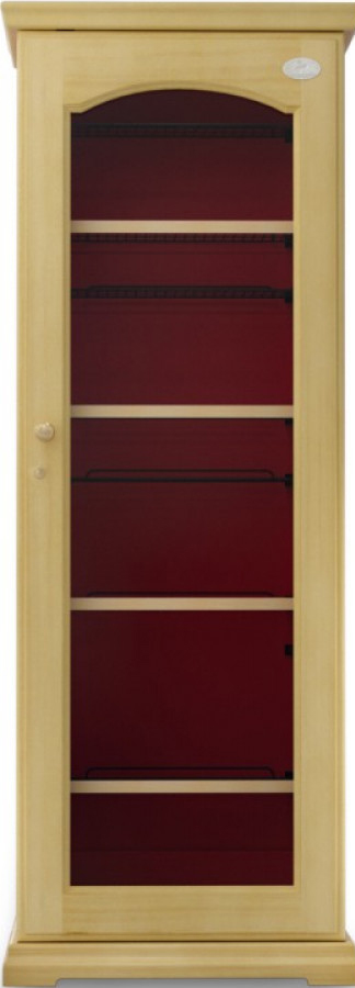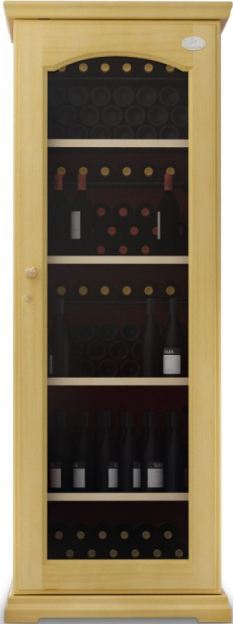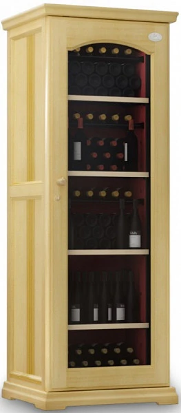 Корпус модели металлический, внешняя отделка винного шкафа выполнена из древесины Risto Line в четырех цветовых решениях. Дверца - из двойного стеклопакета с защитой от уф лучей, имеет встроенный замок и удобную ручку в классическом стиле.
