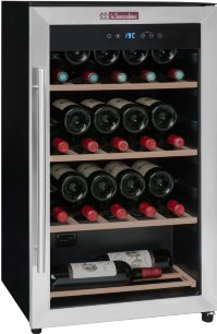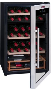 Небольшой монотемпературный винный шкаф La Sommeliere LS36A позволяет хранить до 36 бутылок (типа Бордо). Стеклянная дверца шкафа имеет АУФ-тонировку, поэтому хорошо защищает вина. 3 полки + 1 полуполка из дерева. Уровень шума 42 дБ.