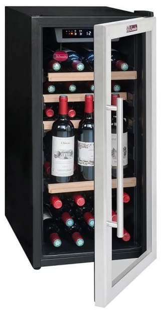 Стеклянная дверца шкафа имеет АУФ-тонировку, поэтому хорошо защищает вина. Практичные металлические полки с деревянной лицевой панелью обеспечивают оптимальное расположение бутылок в шкафу.
