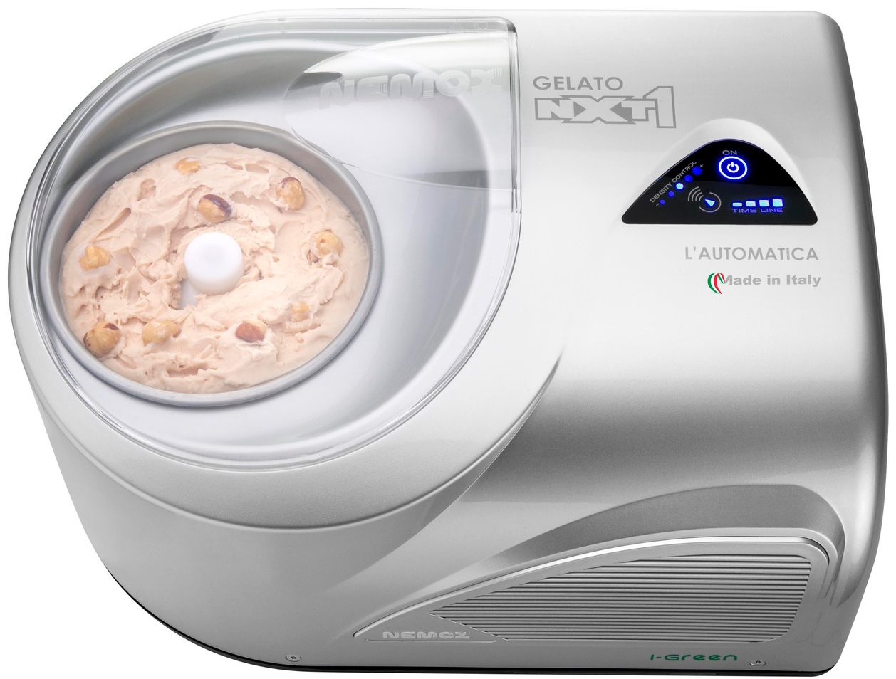 Мороженица Nemox NXT1 L'Automatica Silver i-Green - это единственная в мире суперавтоматическая машина для приготовления мороженого в домашних условиях! Одно прикосновение к сенсорному экрану активирует производство мороженого, пломбира, замороженного йогурта, а также сорбета.