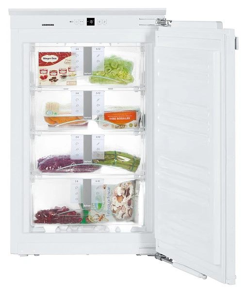 Компактный встраиваемый морозильник Liebherr IGN 1664 с системой No-Frost. Благодаря этой системе, замораживание осуществляется при помощи циркуляции охлажденного воздуха и отвода избыточной влаги. В результате этого в камере не образуется лед, а замороженные продукты не покрываются слоем инея. Для комфорта использования прибор оснащен выдвижными контейнерами FrostSafe с особенно высоким исполнением и закрытой конструкцией. Если вы загружаете большое количество продуктов сразу, для их сохранности используйте режим шоковой заморозки SuperFrost с автоматическим отключением через 65 часов. В верхней части прибора расположена электронная панель управления MagicEye с цифровой индикацией температуры. Система Vario позволяет убирать полки и ящики для размещения продуктов, которые в них не помещаются.