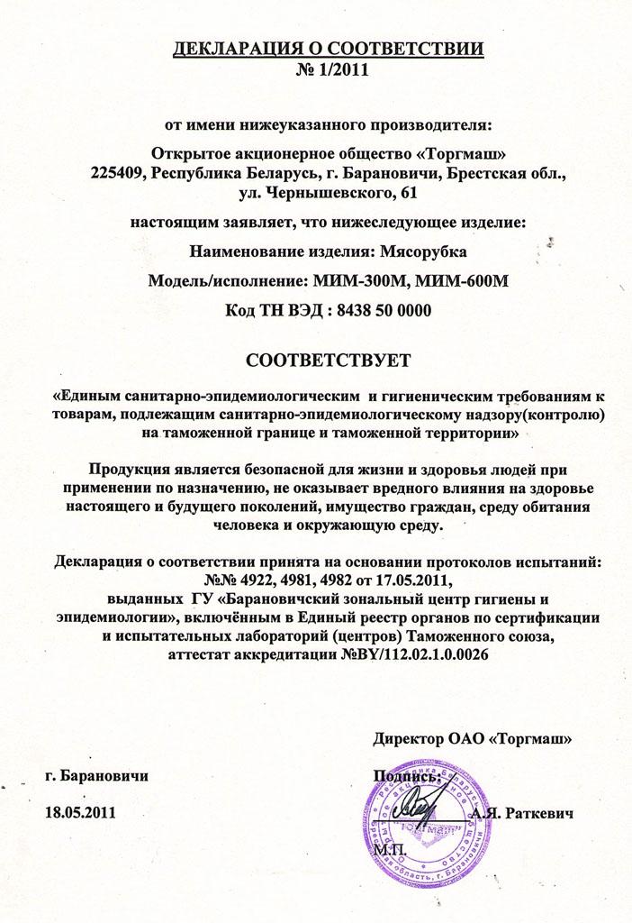 *Практическая производительность мясорубки зависит от скорости подачи оператором порезанного кусочками продукта к шнеку, сортности перерабатываемого мяса, качества заточки инструмента