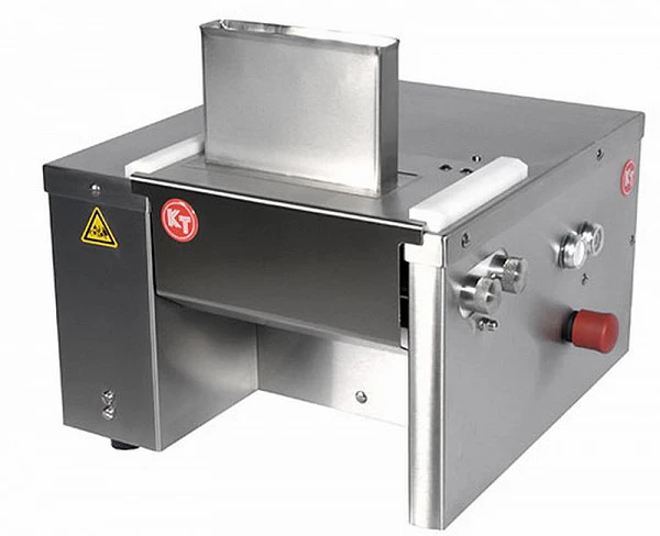 • кусок мяса опускается в приемную воронку сменного механизма, где он захватывается вращающимися навстречу друг другу ножами;