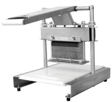 Оператору необходимо положить продукт высотой не больше 12 см на рабочую поверхность под лезвия. Далее использовать рукоятку для опускания и поднимания лезвий. Передвигайте рабочую поверхности для равномерного пронизывания по всей поверхности продукта.