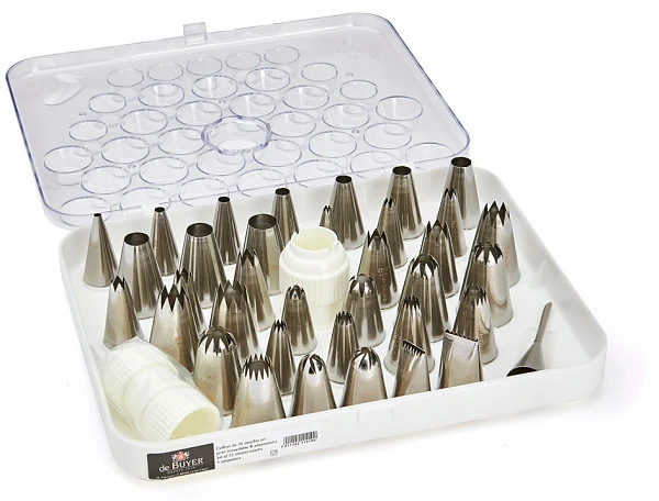Набор из 35 насадок De Buyer 2114.10 применяется в кулинарии для декорирования тортов, пирожных и других десертов.