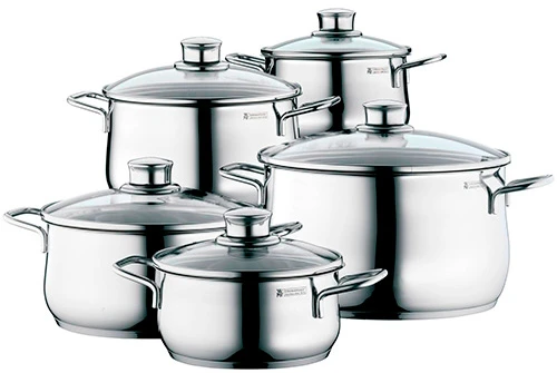Набор кастрюль WMF 07.3008.6040 из 5 предметов Diadem Plus из нержавеющей стали с утонченными и надежными ручками подходят для приготовления как небольших порций, так и блюд для большой семьи. Слегка выпуклая форма корпуса придает посуде элегантный вид. Универсальное дно TransTherm® с алюминиевым диском быстро и равномерно распределяет нагрев по всей посуде и долго сохраняет тепло внутри.