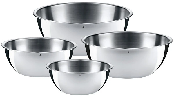 Набор кухонных мисок WMF 06.4570.9990 4 шт Gourmet пригодятся на любой кухне. Смешайте в них ингредиенты для пирога, замаринуйте курицу целиком, подавайте салат или закуски и снеки — набор кухонных мисок WMF из коллекции Gourmet состоит из 4 изделий разного диаметра и дарит вам полную свободу действий. Элегантный выпуклый дизайн облегчает использование венчика, а широкий край помогает сливать жидкое тесто без капель. Миски выполнены из высококачественных материалов, поэтому их можно мыть в посудомоечной машине.