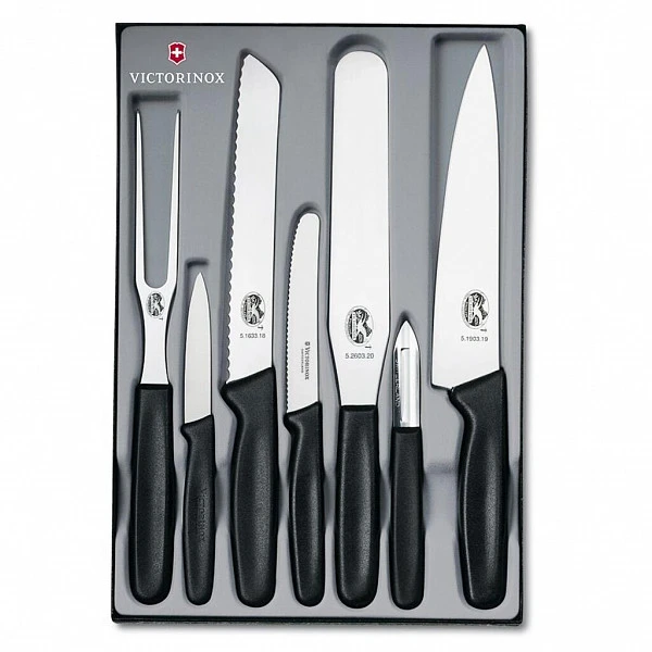 Набор ножей Victorinox с пластиковыми ручками, 7 шт состоит из 7-ми предметов предназначеных для решения различных кулинарных задач. Многие домохозяйки предпочитают купить сразу набор ножей на кухню чем каждый нож по отдельности, при этом это выгодней с финансовой точки зрения.