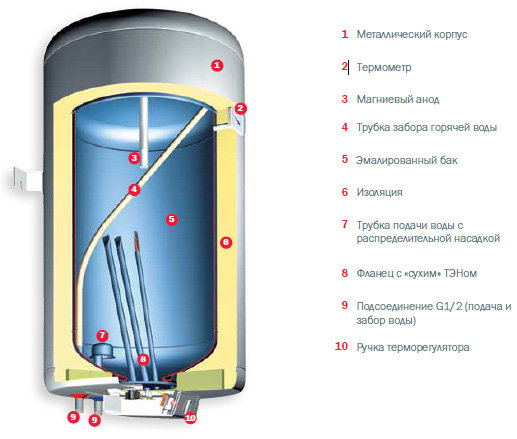 Нагревательные элементы вставляются снаружи в стальной эмалированный фланец, что обеспечивает длительный срок службы, так как нагревательные элементы не находятся в контакте с водой.