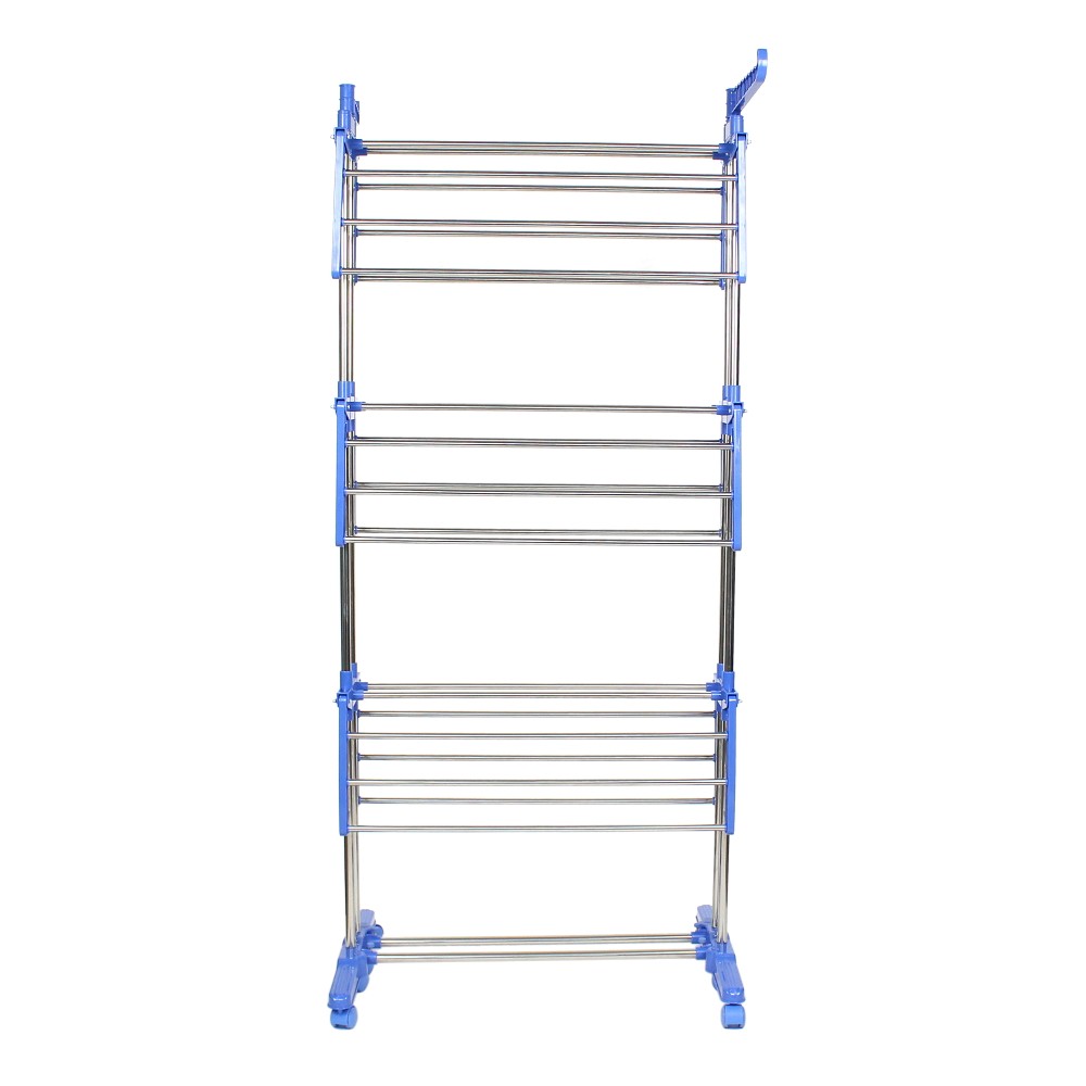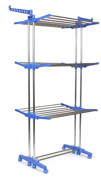 Расстояние между самими трубками позволяет свободно проходить воздуху между развешанной одеждой, быстро высушивая её. Полочки напольной сушилки складные, и в их опущенном положении Mie Branzi становится совсем компактным устройством. В рабочем собранном состоянии размеры сушилки 75−64−165 см. Конструкция полочек Mie Branzi имеет способность складываться. Так вы можете применять такую возможность по своему усмотрению. Чтобы просушить одежду, не складывая, развесьте её на плечиках за самую верхнюю полочку, а нижние сложите.