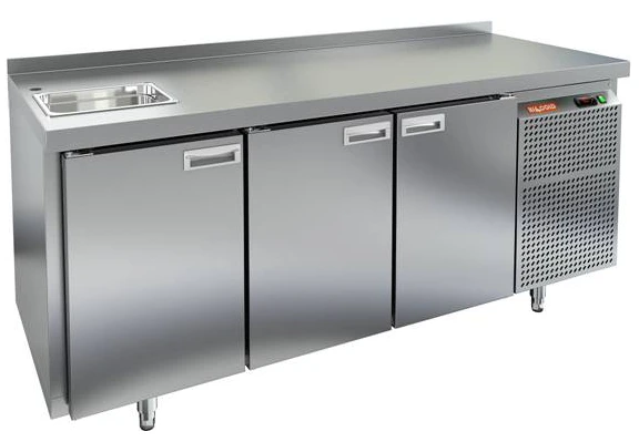 Охлаждаемый стол Hicold GN 11/TN 1G с мойкой, распашными дверцами и боковым расположением агрегата предназначен для обработки ингредиентов для приготовления блюд, а также кратковременного хранения скоропортящихся продуктов и напитков на предприятиях общественного питания и торговли.