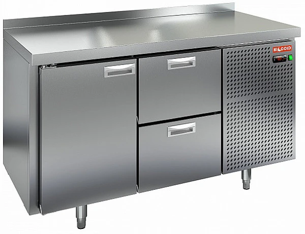 Охлаждаемый стол Hicold GN 12 BR2 TN с распашной дверцей, двумя выдвижными ящиками предназначен для обработки ингредиентов для приготовления блюд, а также кратковременного хранения скоропортящихся продуктов и напитков на предприятиях общественного питания и торговли.