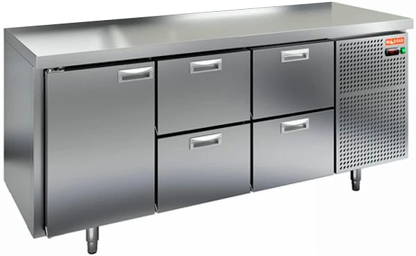 Охлаждаемый стол Hicold GN 122/TN О с распашной дверцей, 4 ящиками и боковым расположением агрегата предназначен для обработки ингредиентов для приготовления блюд, а также кратковременного хранения скоропортящихся продуктов и напитков на предприятиях общественного питания и торговли.