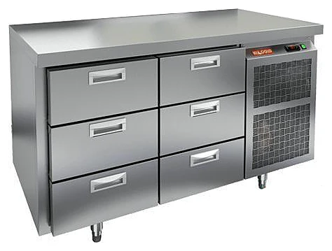 Охлаждаемый стол Hicold GN 33/TN O с шестью ящиками и боковым расположением агрегата предназначен для обработки ингредиентов для приготовления блюд, а также кратковременного хранения скоропортящихся продуктов и напитков на предприятиях общественного питания и торговли.