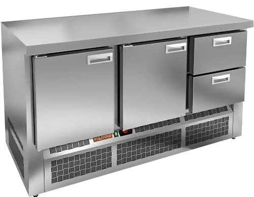 Охлаждаемый стол Hicold GNE 112/TN O с распашными дверцами, двумя ящиками и нижним расположением агрегата предназначен для обработки ингредиентов для приготовления блюд, а также кратковременного хранения скоропортящихся продуктов и напитков на предприятиях общественного питания и торговли.