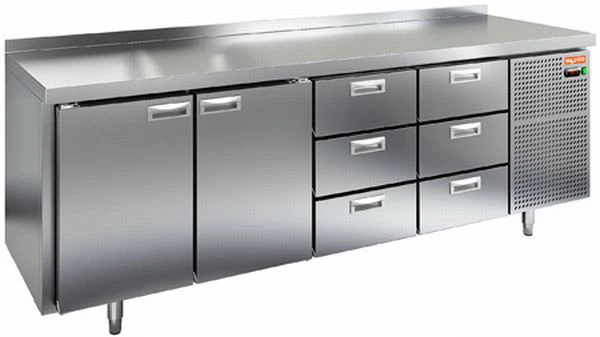 Охлаждаемый стол Hicold SN 1133/TN с распашными дверцами, шестью ящиками и боковым расположением агрегата предназначен для обработки ингредиентов для приготовления блюд, а также кратковременного хранения скоропортящихся продуктов и напитков на предприятиях общественного питания и торговли.