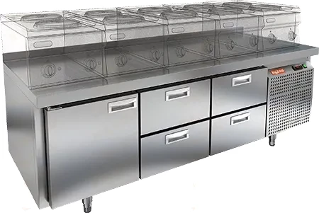 Охлаждаемый стол Hicold SN 122/TN LT под тепловое оборудование с распашной дверцей, четырьмя ящиками и боковым расположением агрегата предназначен для использования на предприятиях общественного питания.