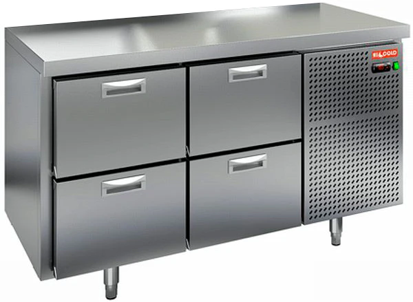 Охлаждаемый стол Hicold SN 22/TN O с 4 ящиками и боковым расположением агрегата предназначен для обработки ингредиентов для приготовления блюд, а также кратковременного хранения скоропортящихся продуктов и напитков на предприятиях общественного питания и торговли.