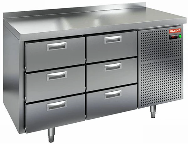 Охлаждаемый стол Hicold SN 33/TN с шестью ящиками и боковым расположением агрегата предназначен для обработки ингредиентов для приготовления блюд, а также кратковременного хранения скоропортящихся продуктов и напитков на предприятиях общественного питания и торговли.