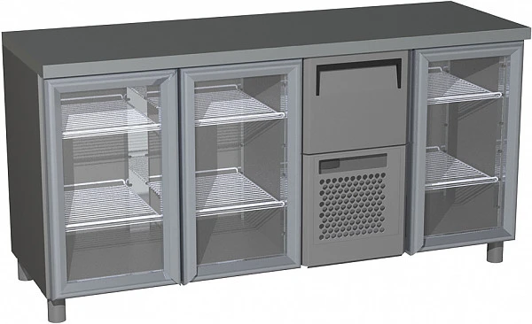 Охлаждаемый стол Полюс T57 M3-1-G X7 0430-19 корпус нержавеющая сталь, без борта, планка (BAR-360C Carboma) серии 570 COFFEE BAR может быть использован под кофемашины и для хранения молока и кофейных зерен. В данном столе предусмотрен удобный отсек для выбивания холдера кофемашины (ящик над агрегатным отсеком).